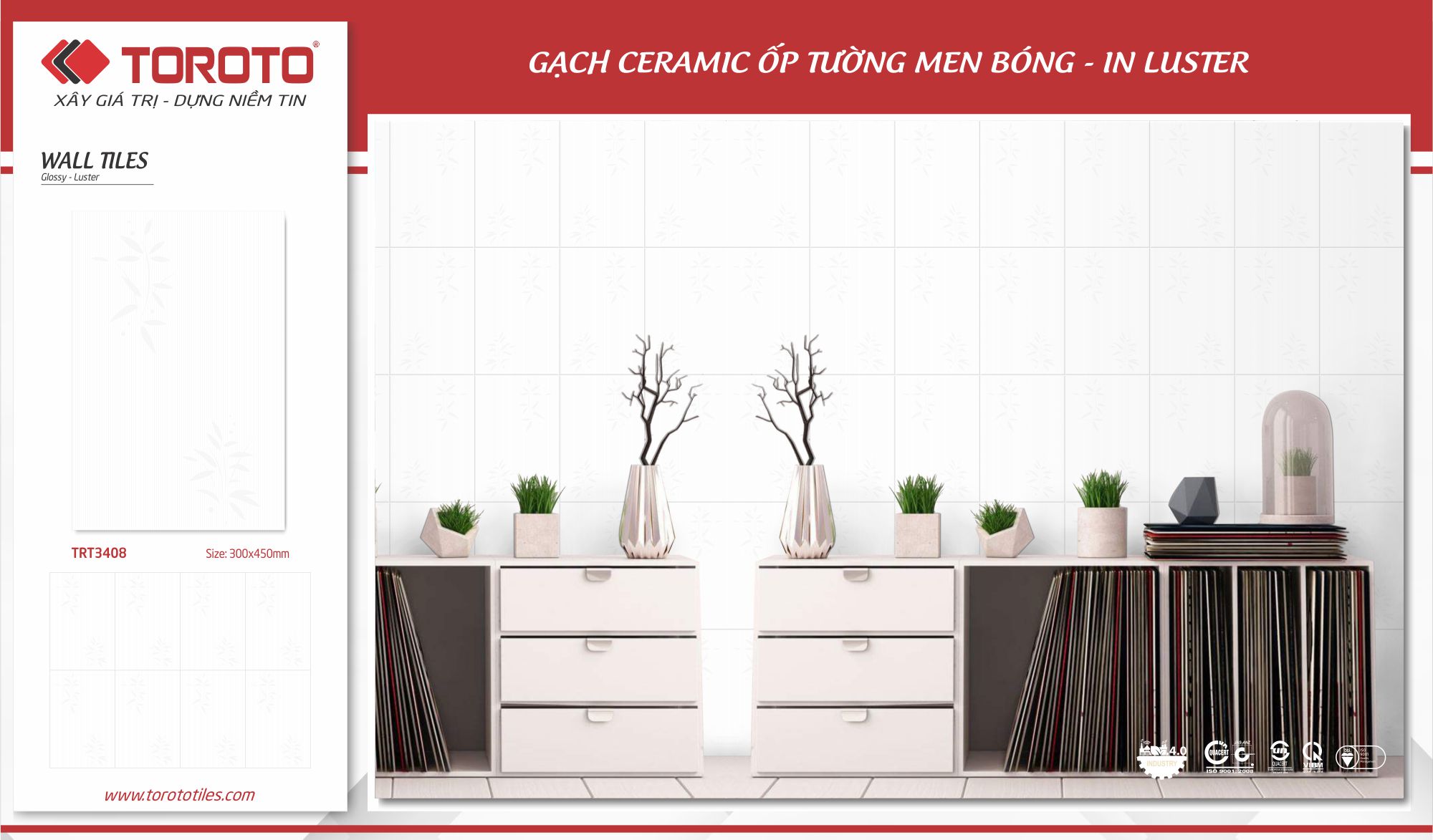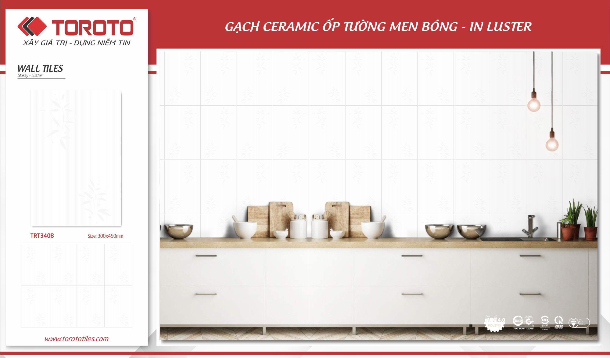 Gạch ốp tường men bóng, in Luster, kích thước 30x45cm.